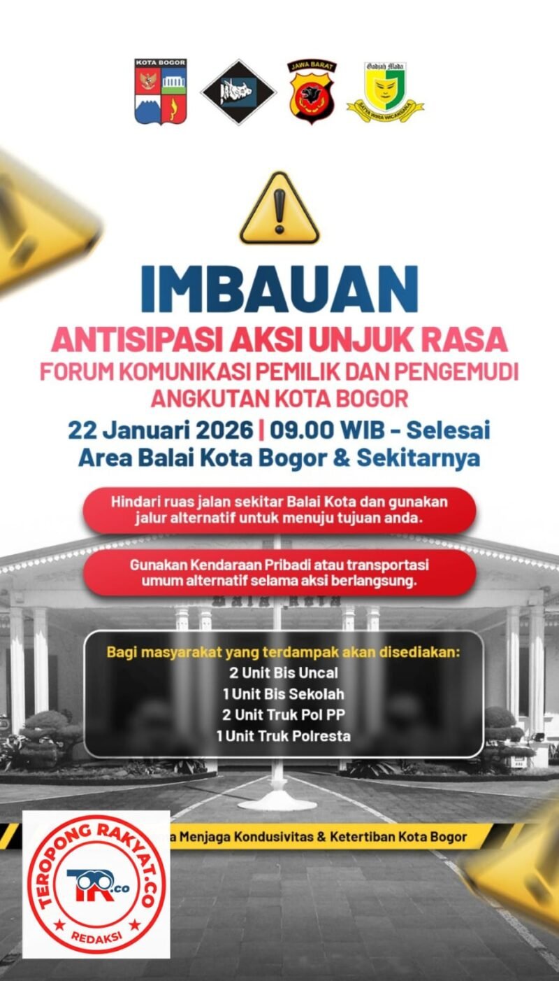 Bogor, teropongrakyat.co – Masyarakat Kota Bogor diimbau untuk meningkatkan kewaspadaan dan mengatur ulang rute perjalanan pada Kamis, 22 Januari 2026, seiring rencana aksi unjuk rasa Forum Komunikasi Pemilik dan Pengemudi Angkutan Kota (FKPP-AK) Bogor yang akan berlangsung di area Balai Kota Bogor dan sekitarnya.