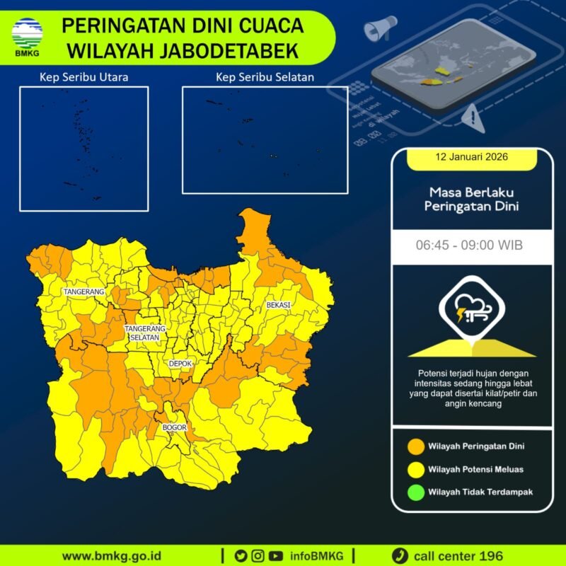 Jakarta, teropongrakyat.co – Badan Meteorologi, Klimatologi, dan Geofisika (BMKG) mengeluarkan peringatan dini cuaca untuk wilayah Jabodetabek pada Senin, 12 Januari 2026. Peringatan ini berlaku mulai pukul 06.45 hingga 09.00 WIB.