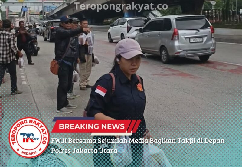 Jakarta Utara, TeropongRakyat.co – Forum Wartawan Jaya Indonesia (FWJI) bersama sejumlah awak media menggelar kegiatan berbagi takjil kepada masyarakat yang melintas di depan Polres Metro Jakarta Utara, Jalan Yos Sudarso, Kecamatan Koja, Jakarta Utara. Kamis, (12/03/2026).