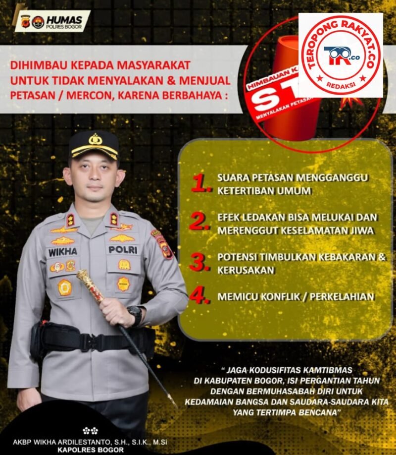 Kabupaten Bogor – Teropongrakyat.co – Kepolisian Resor (Polres) Bogor mengeluarkan imbauan keras kepada masyarakat untuk tidak menyalakan maupun memperjualbelikan petasan dan mercon.