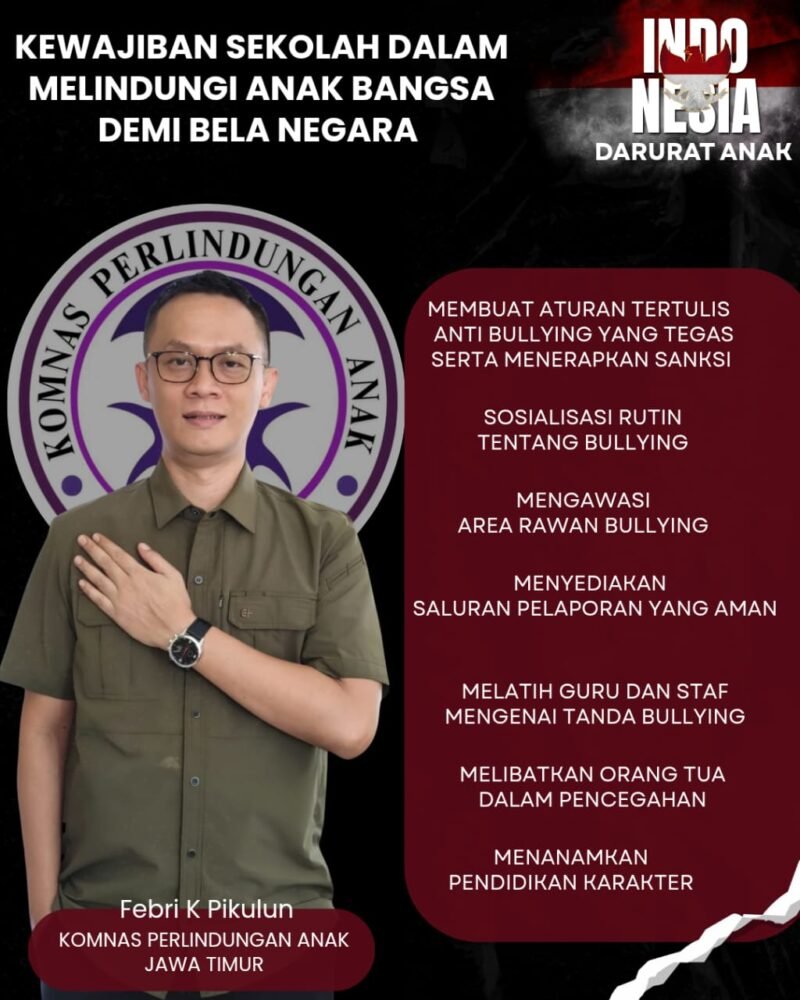 Pasuruan | Teropongrakyat.co — Ketua Komnas Perlindungan Anak Jawa Timur, Febri Kurniawan Pikulun, menegaskan bahwa sekolah memiliki peran strategis dalam melindungi anak bangsa sebagai wujud nyata bela negara. Hal ini disampaikan dalam pernyataannya pada Selasa, 25 November 2025, di Pasuruan.