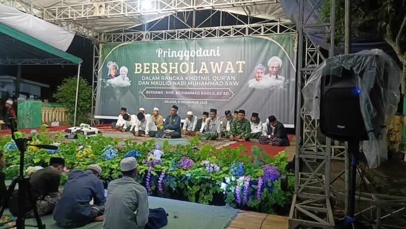 Malang | Teropongrakyat – Ribuan jamaah menghadiri kegiatan Pengajian Umum Khotmil Qur’an dan Peringatan Maulid Nabi Muhammad S.A.W di Pondok Pesantren Miftahush Shibyan, Desa Pringgodani, Kecamatan Bantur, Kabupaten Malang, Selasa malam (9/12/2025). Acara yang dimulai pukul 19.30 WIB tersebut berlangsung khidmat hingga selesai.