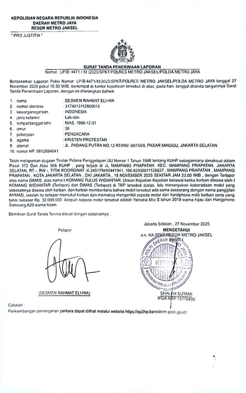 Korban Lapor ke Polres Jakarta Selatan
