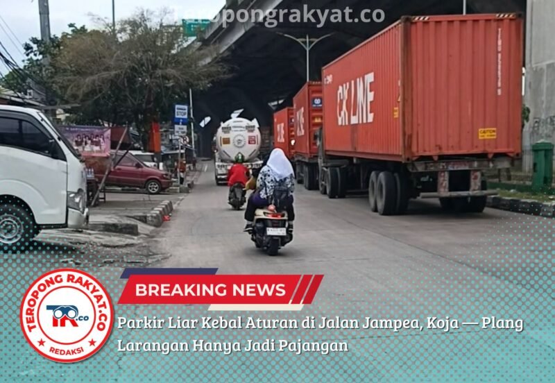 Jakarta Utara, TeropongRakyat.co – Wajah semrawut tata ruang kembali terlihat di Jalan Jampea, Kecamatan Koja. Ruas jalan yang seharusnya menjadi akses vital warga justru berubah fungsi bak kantong parkir raksasa. Truk kontainer hingga mobil pribadi bebas “berjajar rapi” di badan jalan, seolah aturan tak lagi punya wibawa. Kamis, (05/02/2026).