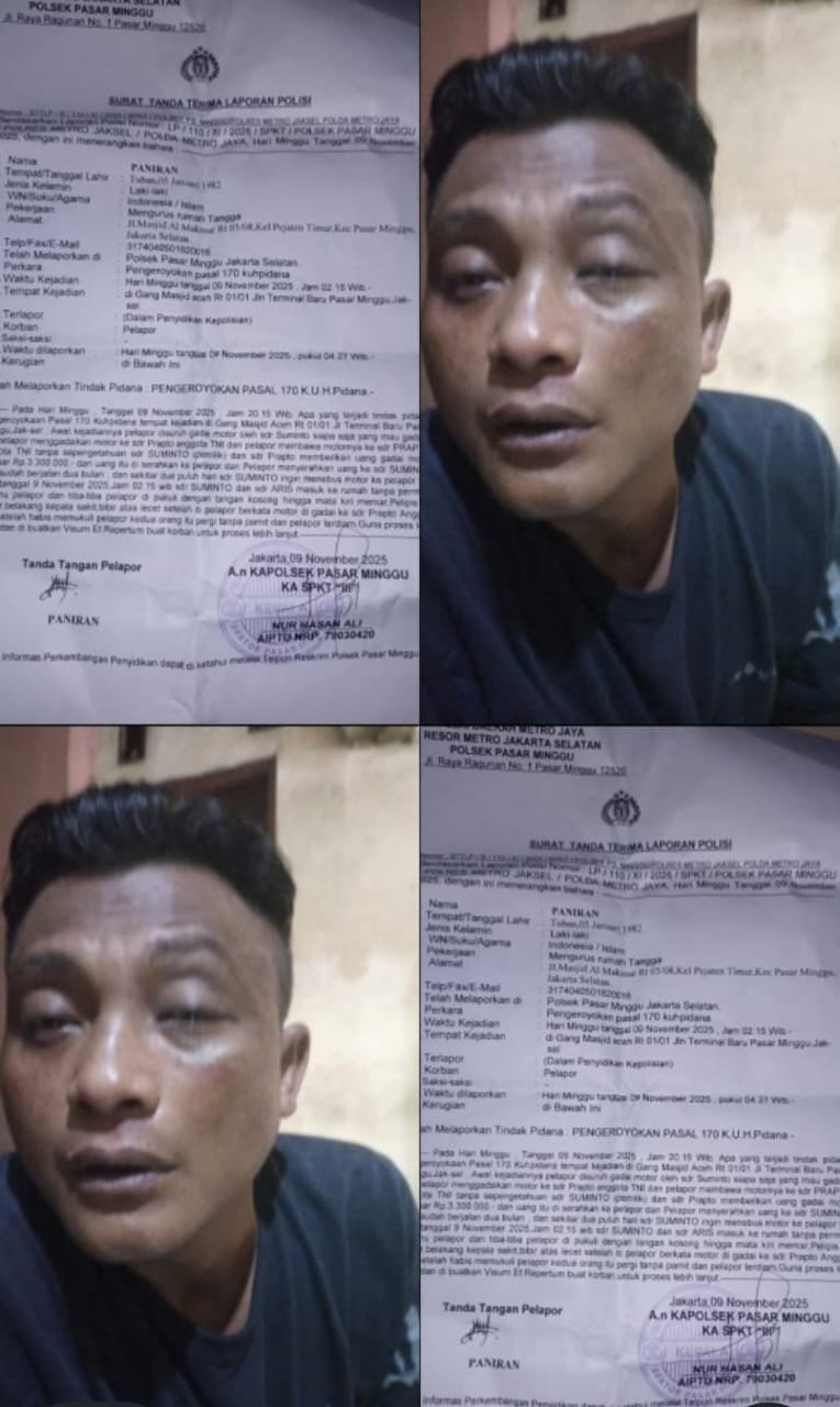 Jakarta, teropongrakyat.co – Sejumlah aktivis meminta aparat kepolisian Polsek Pasar Minggu untuk bersikap tegas dalam menindak pelaku pengeroyokan dan penganiayaan terhadap seorang pria bernama Paniran, yang terjadi di Gang Masjid Aceh RT 01/01, Kecamatan Pasar Minggu, pada Minggu (9/11/2025) sekitar pukul 02.15 WIB.