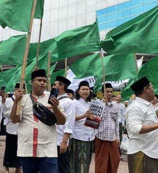 Mereka tampak kompak mengenakan sarung, peci, dan baju koko, sambil mengibarkan bendera hijau bertuliskan kalimat tauhid dan lambang ormas keagamaan.