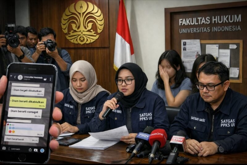 Depok, 15 April 2026 | teropongrakyat.co — Sebanyak 16 mahasiswa di Fakultas Hukum Universitas Indonesia (FH UI) diduga terlibat dalam kasus pelecehan seksual terhadap puluhan mahasiswi hingga dosen. Dugaan ini mencuat setelah tangkapan layar percakapan para terduga pelaku viral di media sosial.